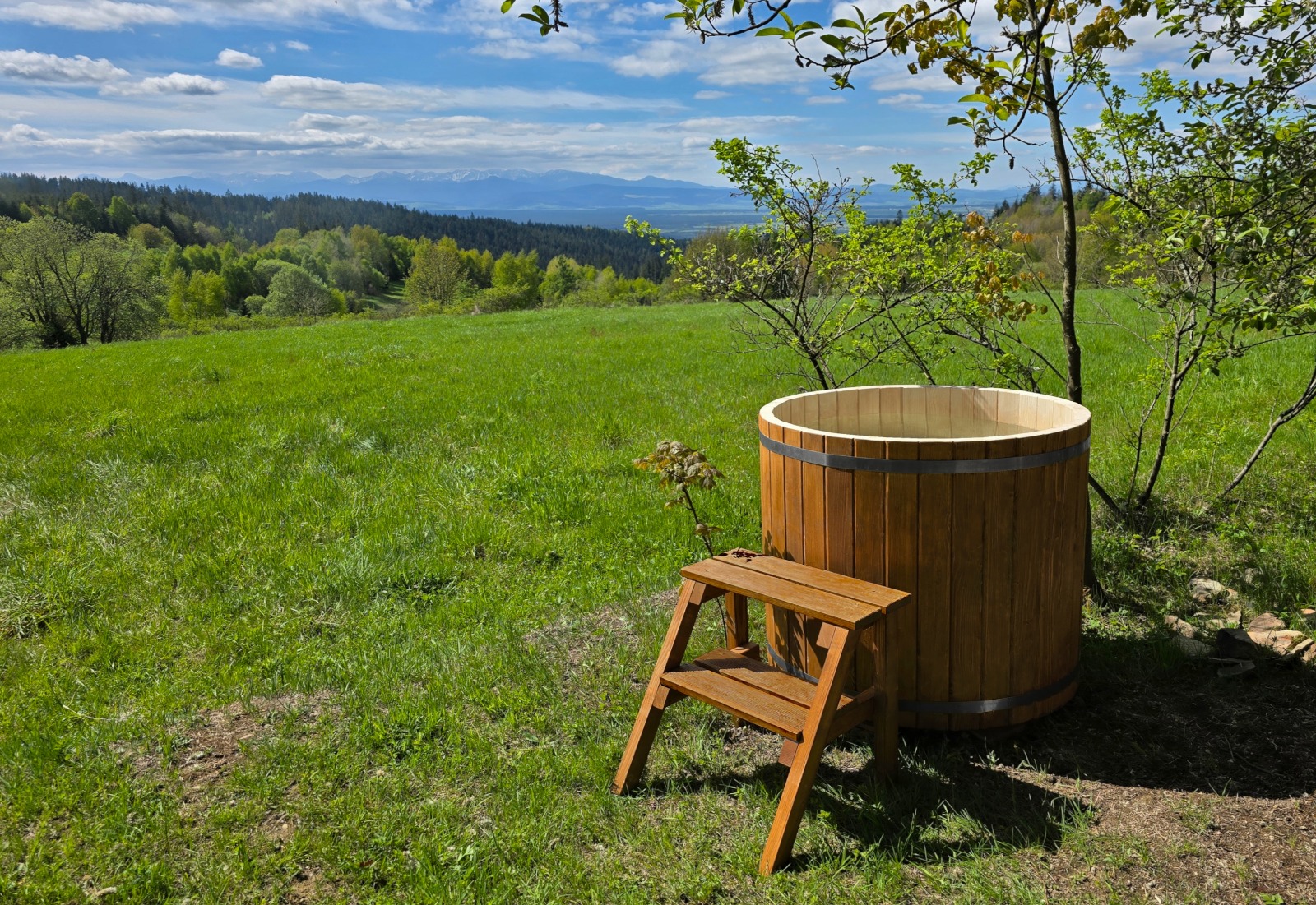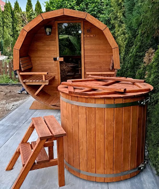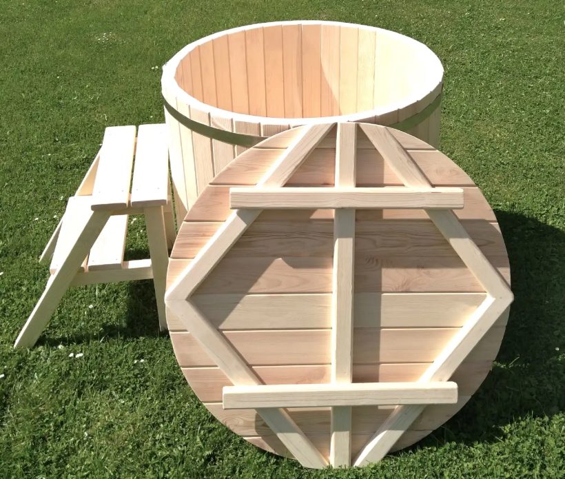 Das Badefass für den Outdoor-Bereich wird inklusive Abdeckung, Sitzbank im Fass und Treppe geliefert.