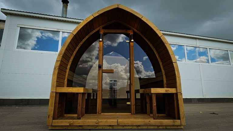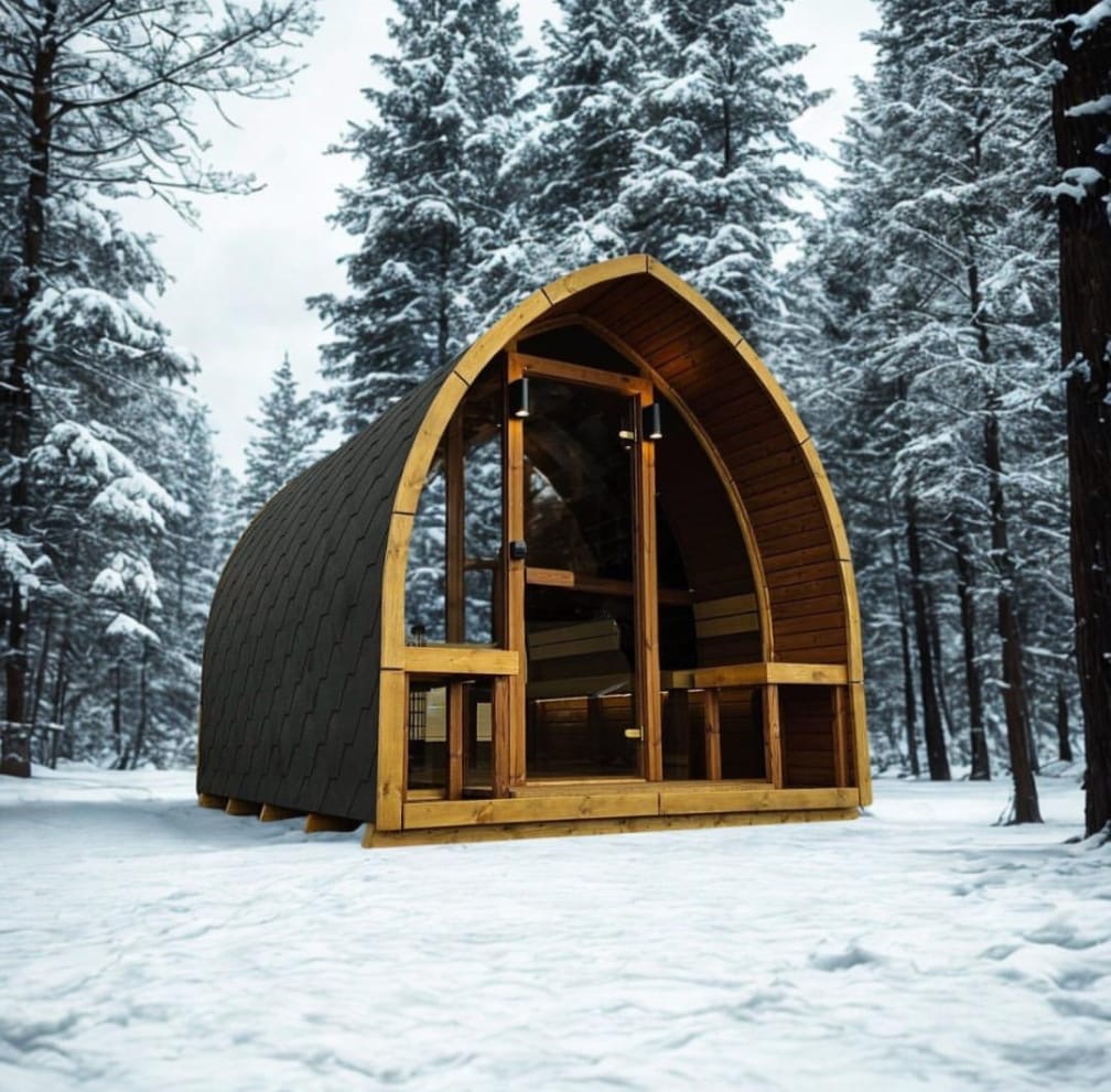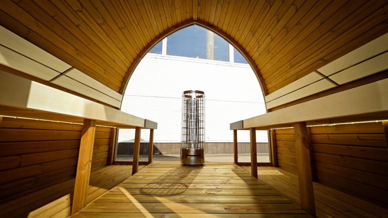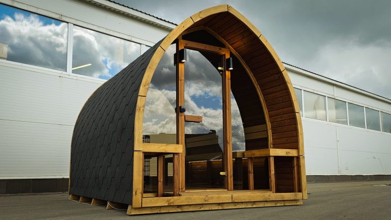 Das Dach und die Seitenwände werden mit grauen Bitumenschindeln gedeckt, die der Sauna einen ganz besonderen Charme verleihen. Die Höhe und Breite der Sauna beträgt jeweils 240cm.