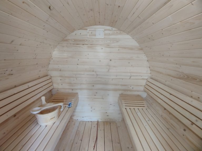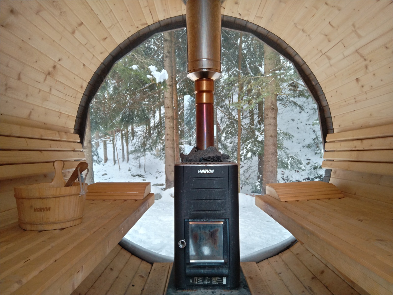 - Sitzbänke und Boden mit speziellem Sauna-Wasserlack versiegelt = leichte Reinigung