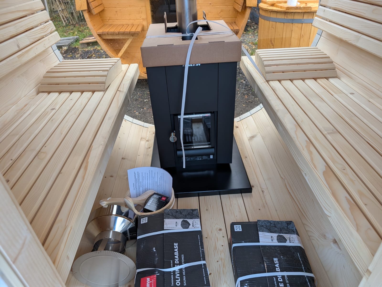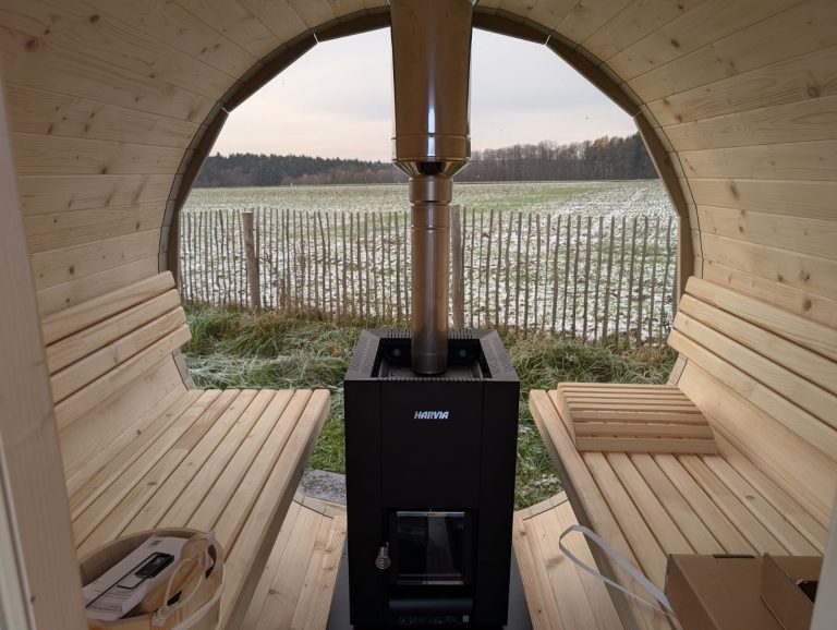 - Wahlweise mit Harvia-Holzofen (zugelassen in Deutschland) oder Harvia-Elektroofen