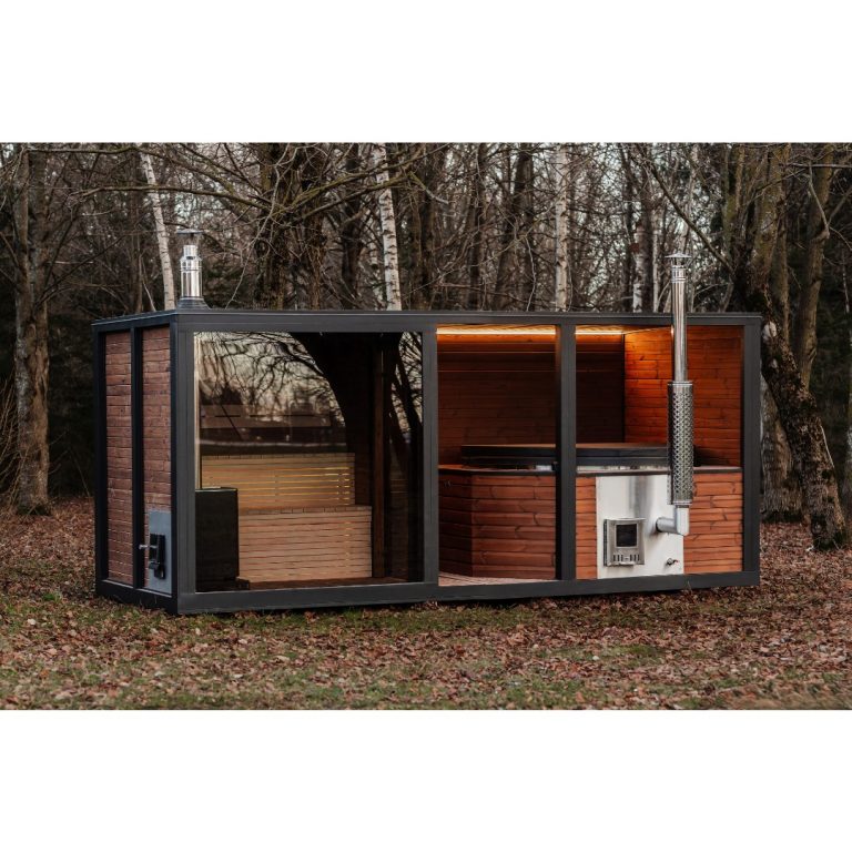 Unsere Spa-Module vereinen Sauna und Hot Tub zu einem kompakten Rückzugsort für Entspannung und Wellness (Maße: 500 x 240 cm). Beide Bereiche können wahlweise mit Holzöfen oder Elektroöfen beheizen werden.
