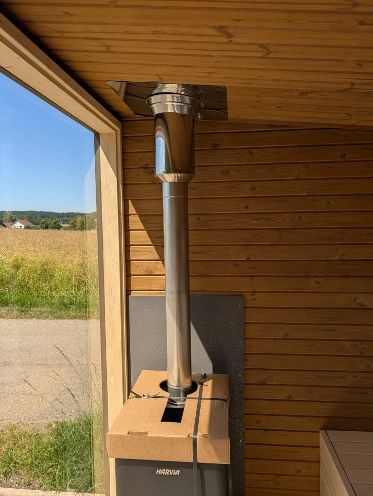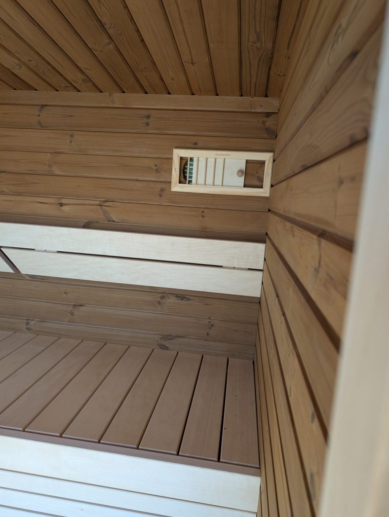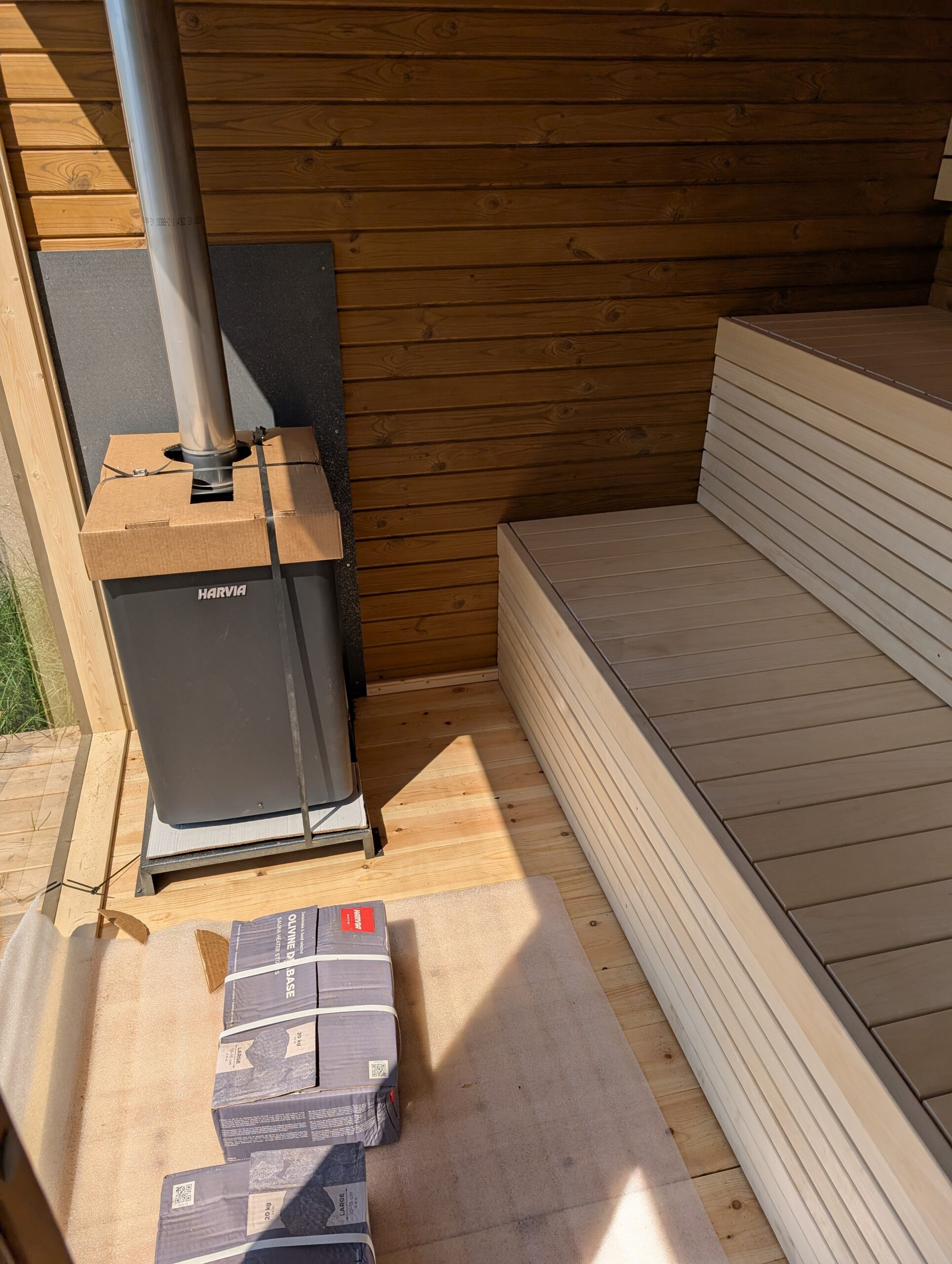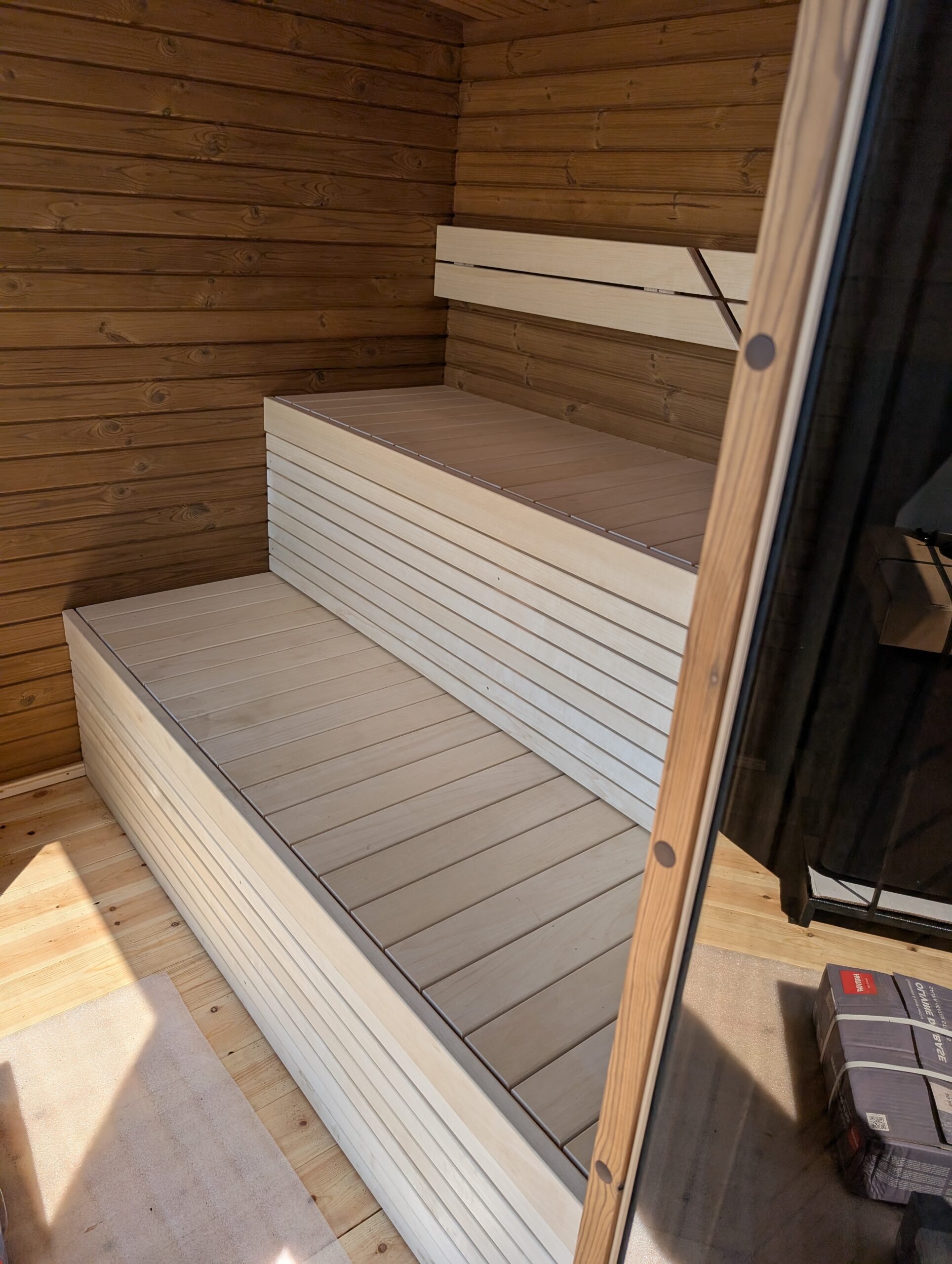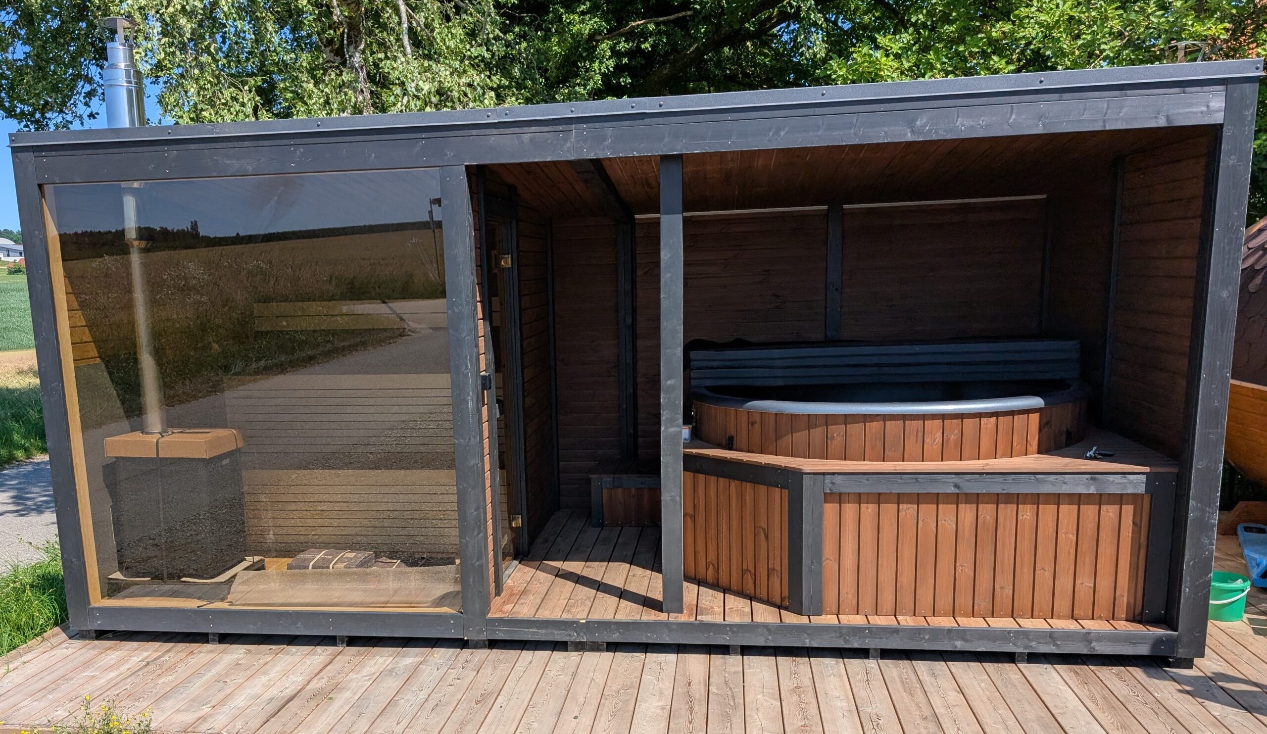 Die Wände bestehen aus witterungsbeständigem 44 mm Thermoholz, der Boden aus Terrassendielen, und die Saunabänke aus Lindenholz. Die Eingangstür zum Saunabereich ist aus Hartglas gefertigt.