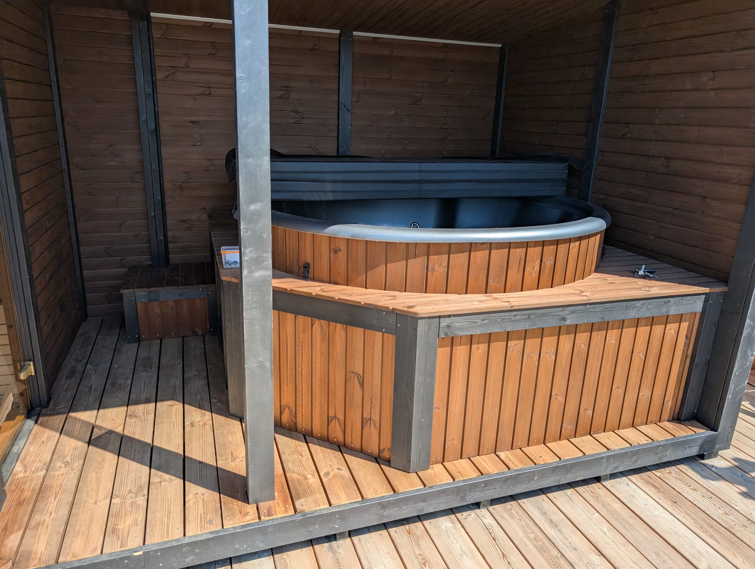 Der Hot Tub verfügt über eine Fiberglas-Wanne (optional auch in Acryl erhältlich) und kann mit bis zu 16 Massagedüsen und 12 Luftsprudeldüsen ausgestattet werden. Zudem ist er von einer eleganten Holzverkleidung aus Thermoholz umschlossen. Ergänzt wird er durch eine praktische Einstiegstreppe sowie eine Thermoabdeckung. Für eine stimmungsvolle Beleuchtung sorgen LEDs unter den Saunabänken, im Whirlpoolbereich, am Saunaeingang sowie in der Hot Tub Wanne.
